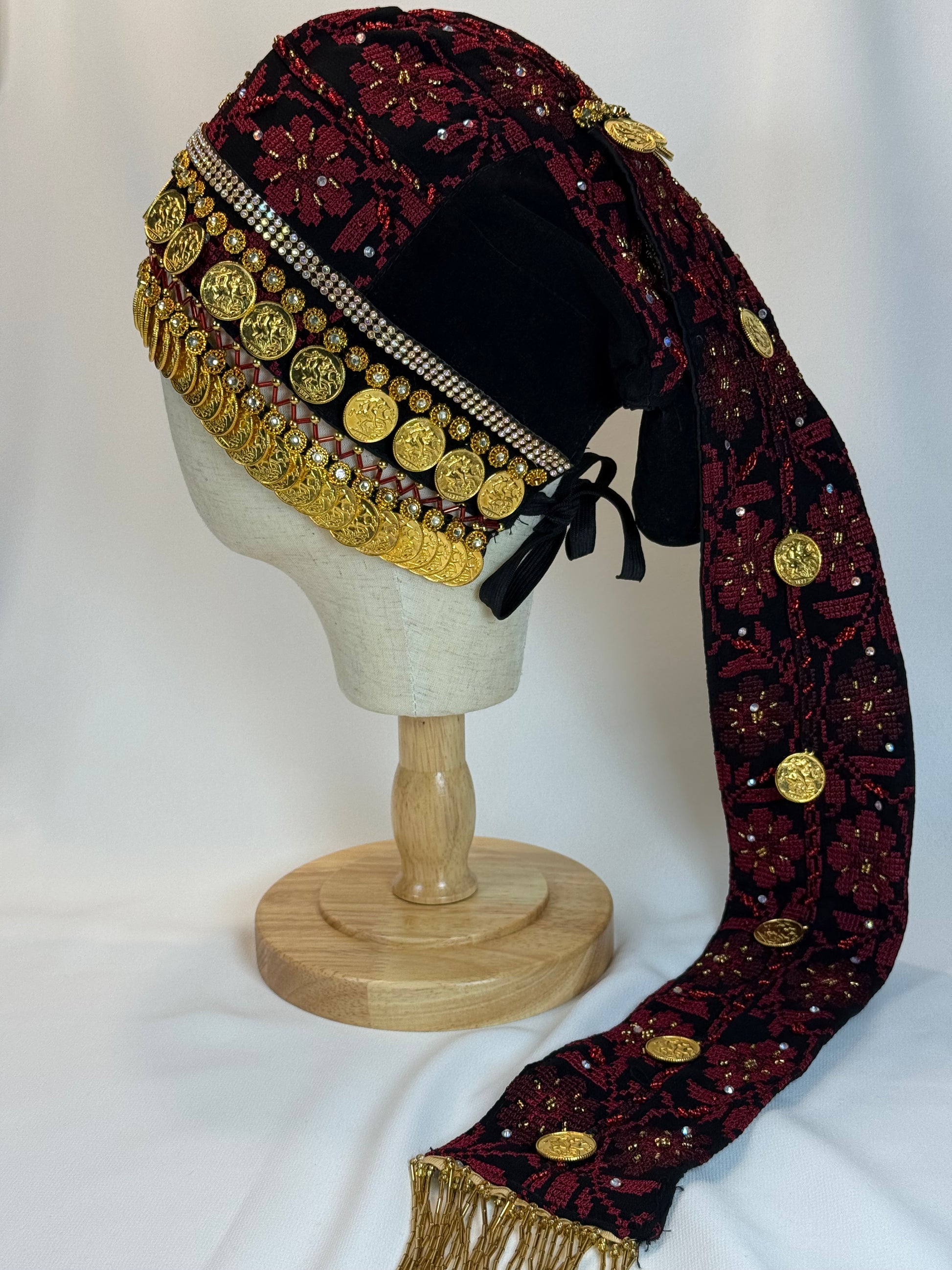 - This hat is machine-embroidered, hand-stitched, and is sold as seen in the pictures listed, including all gold coins and attached parts.