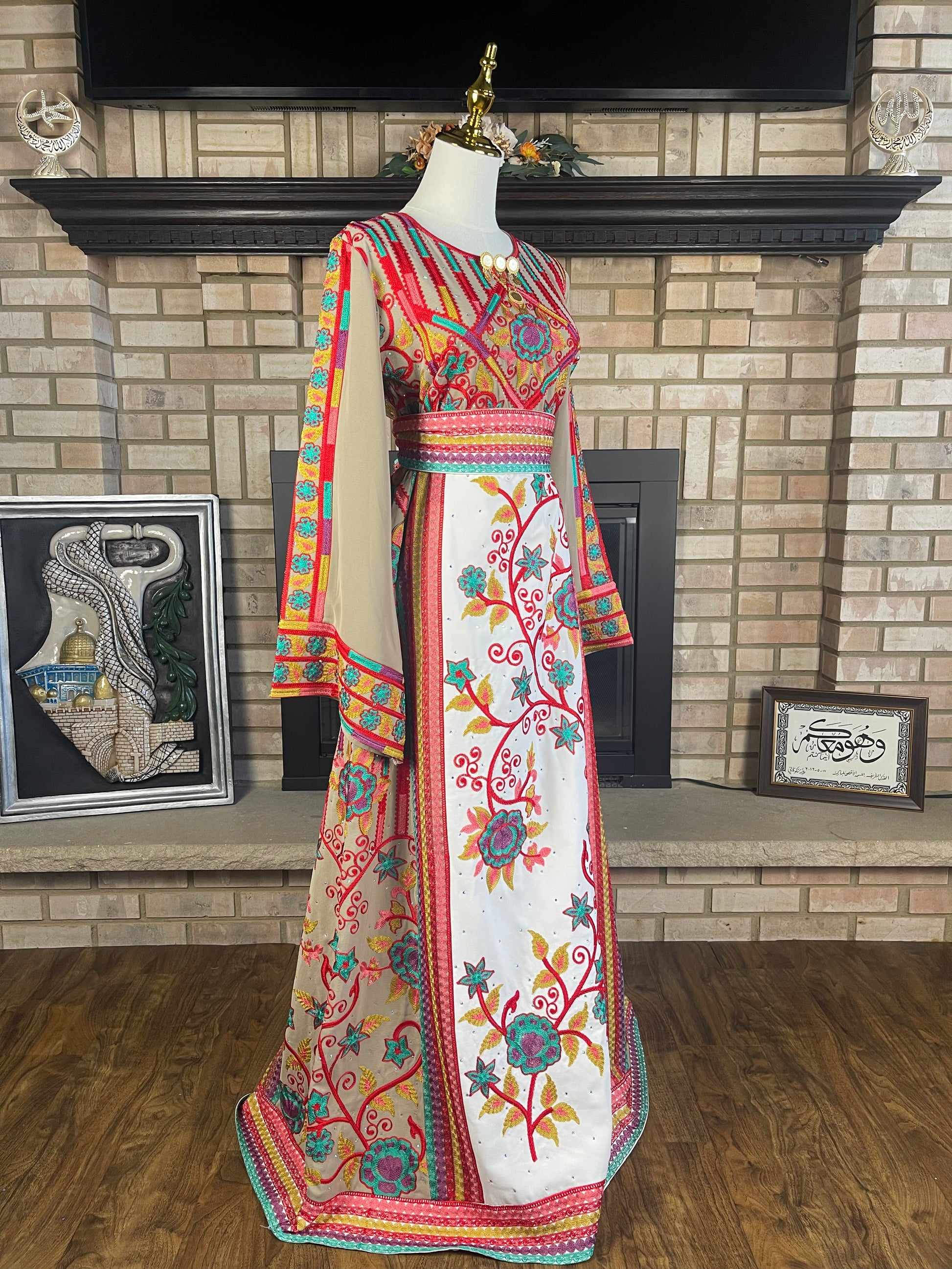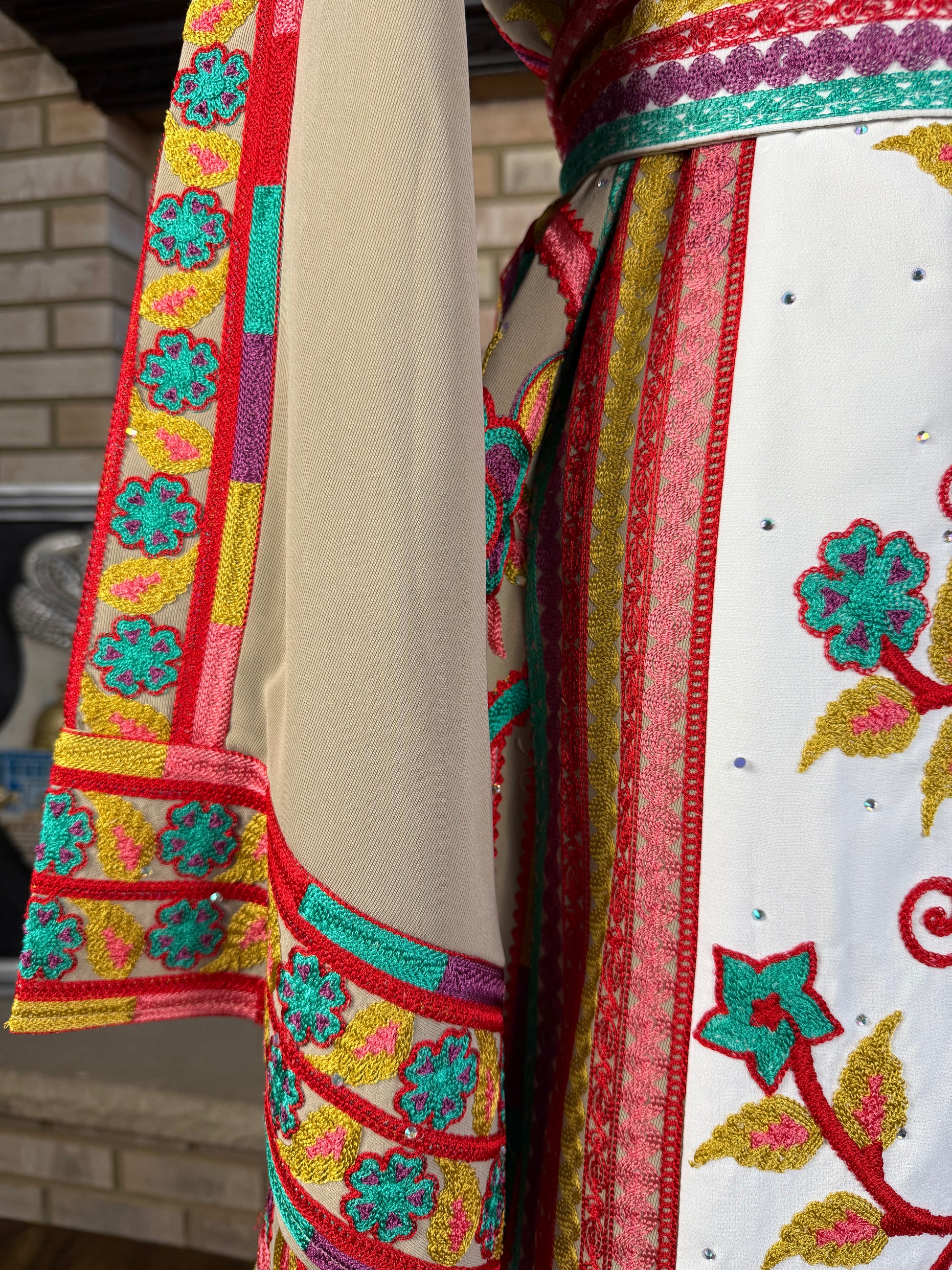 Gorgeous, fully embroidered and rhinestoned thobe, in beige and white fabric with rose pattern embroidery. Fully embroidered over the front and back sides.