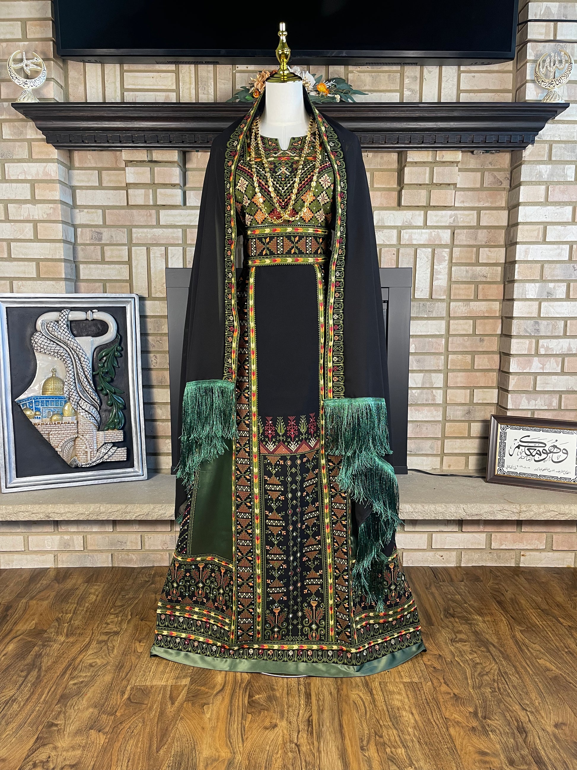 Gorgeous very heavily embroidered and rhinestoned thobe, in black fabric with vibrant green satin accents, and multicolor embroidery.