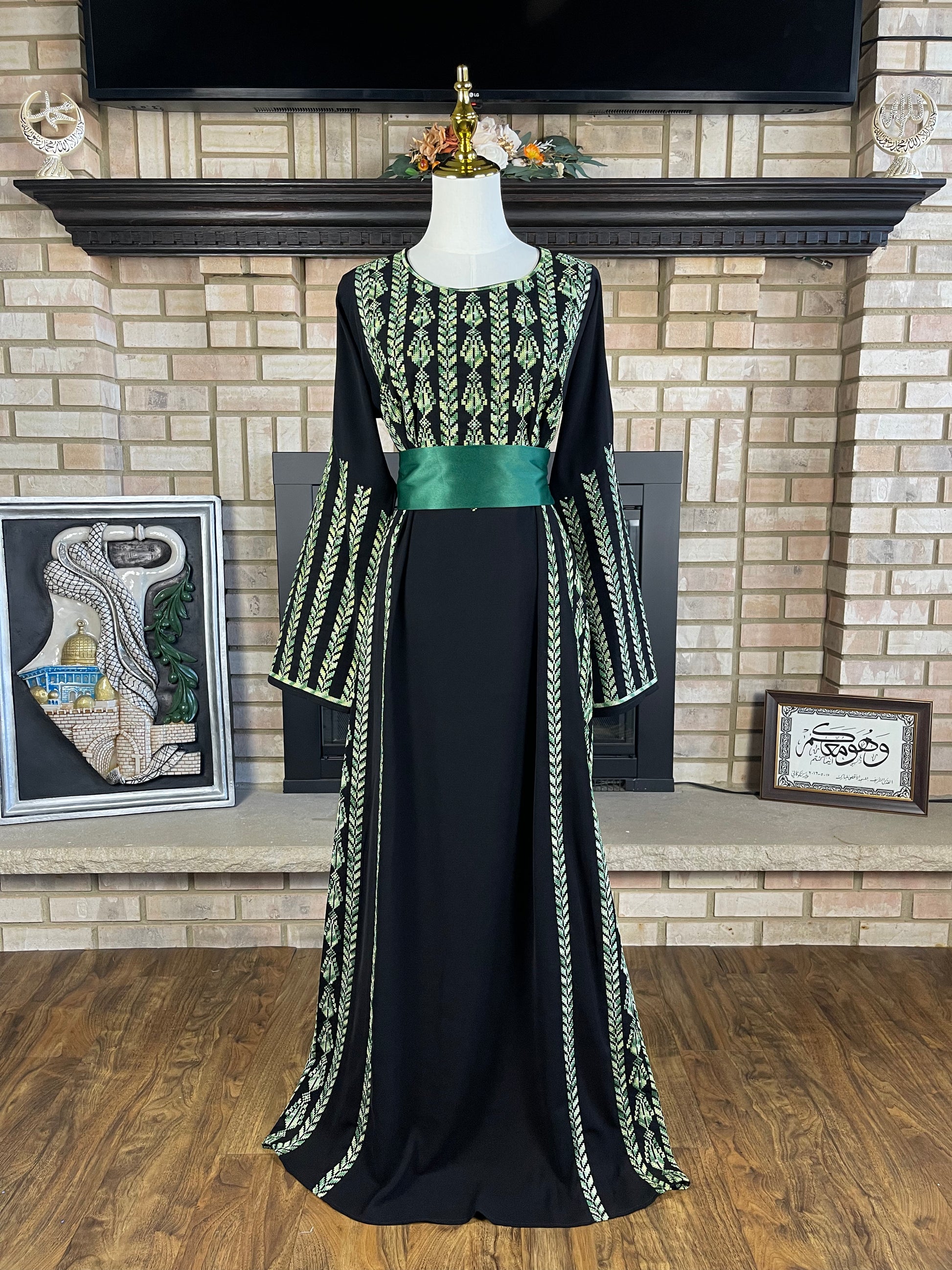 This elegantly-simple black and green Sanabel thobe is elegantly designed with beautiful green embroidery representing wheat plant motifs and sparkling rhinestones. An included embroidery belt completes the outfit!