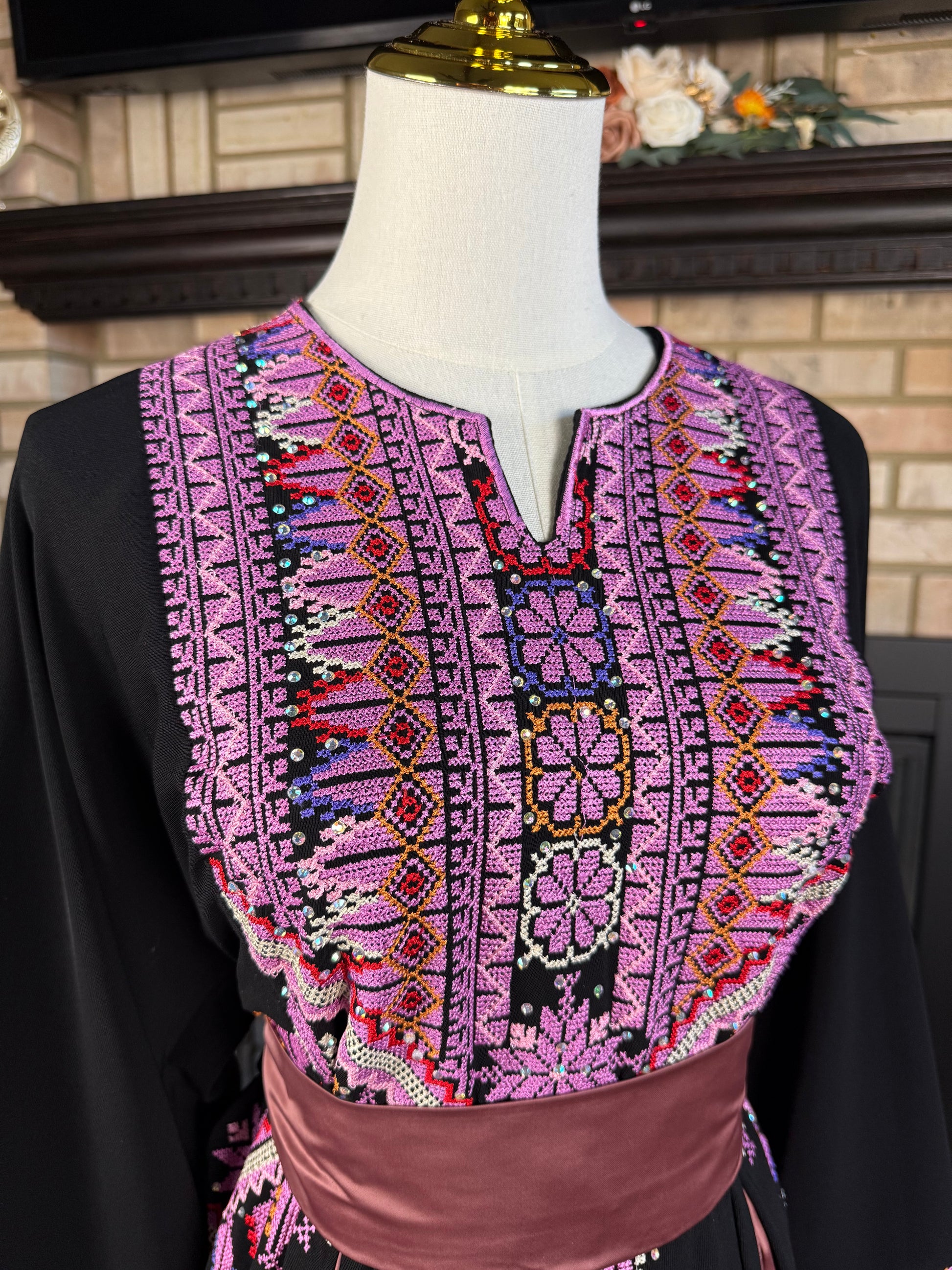 Charming black and lavender thobe, featuring silky satin accents, beautiful cross stitching, and sparkling rhinestones.