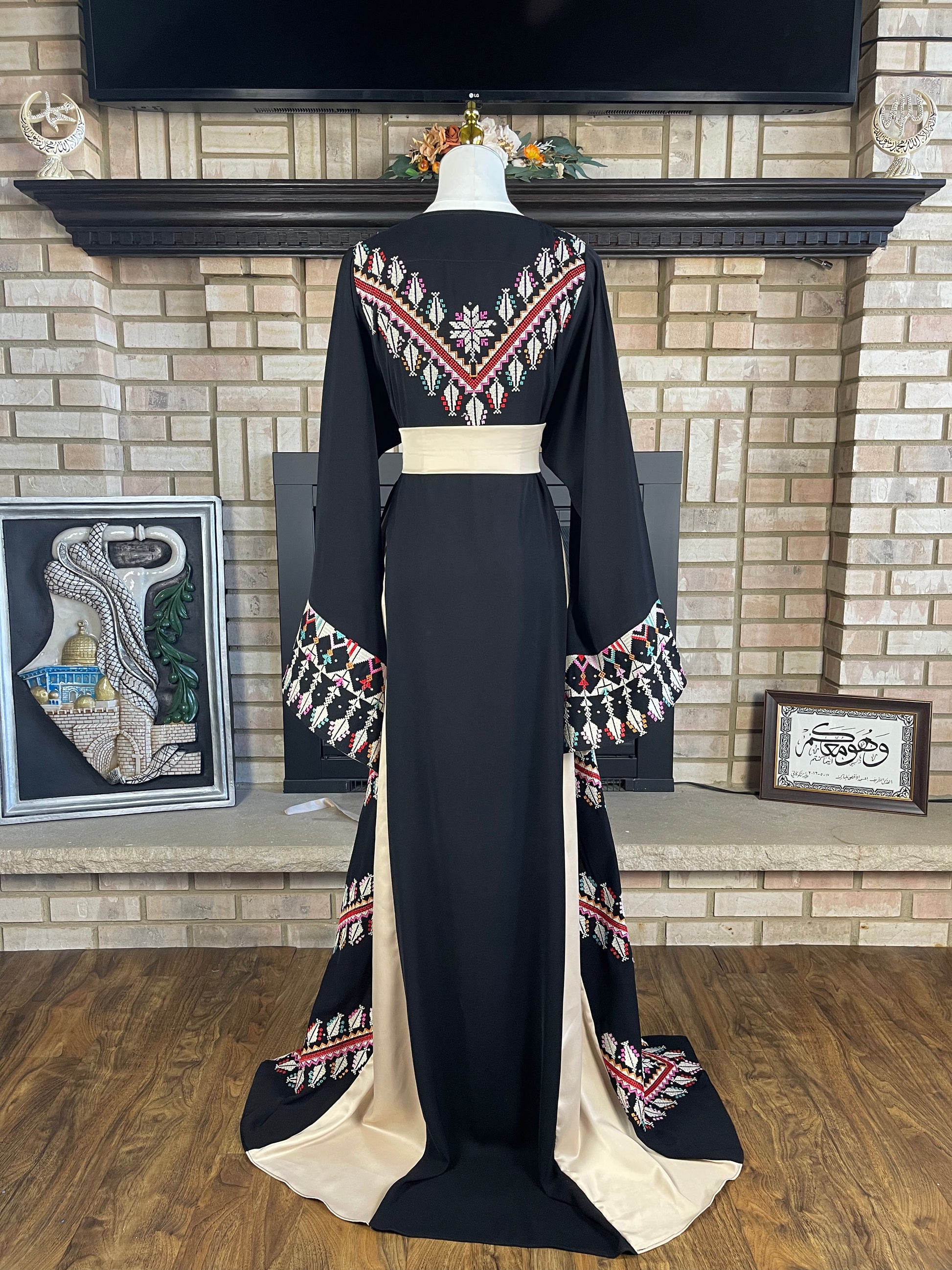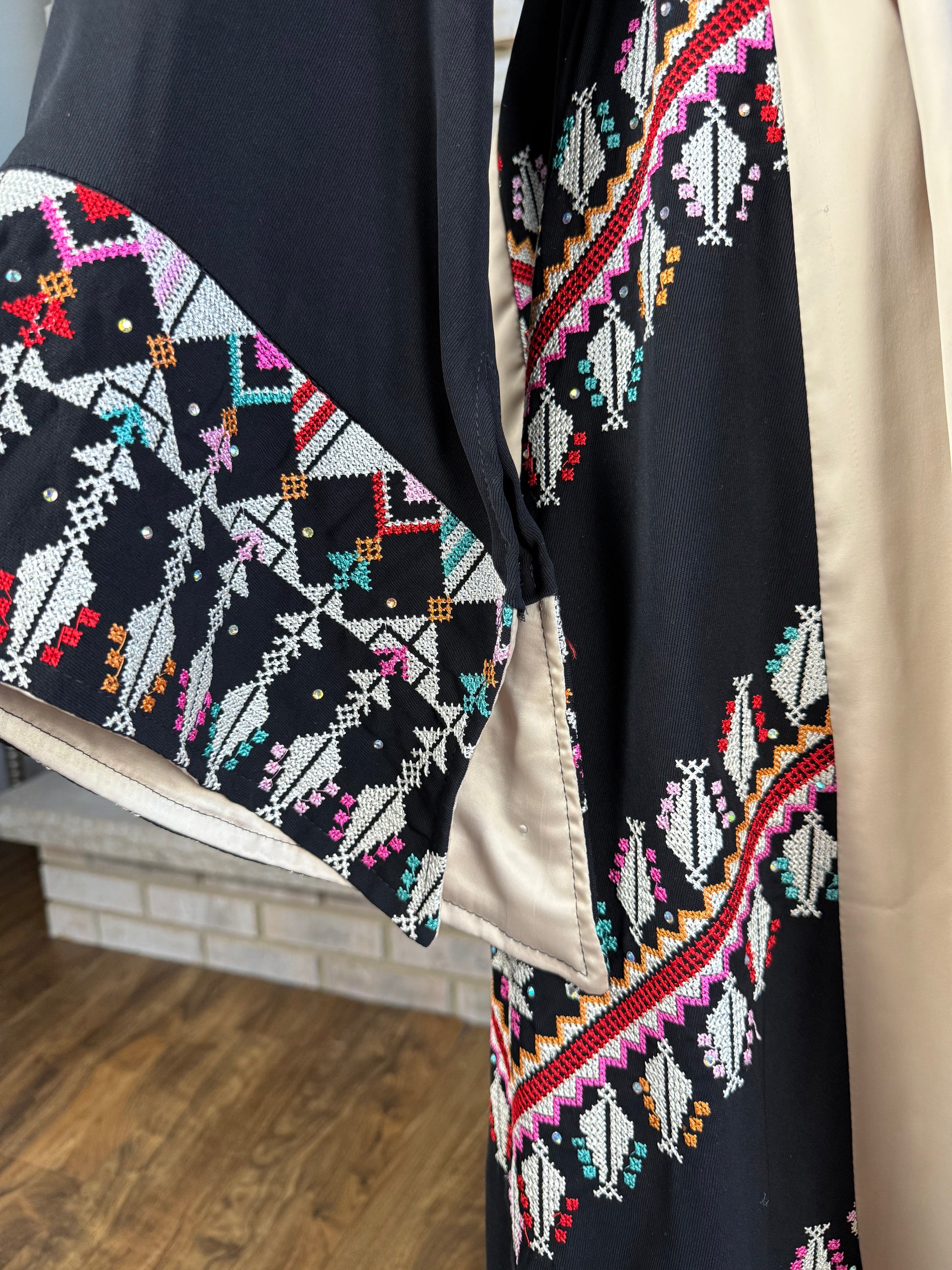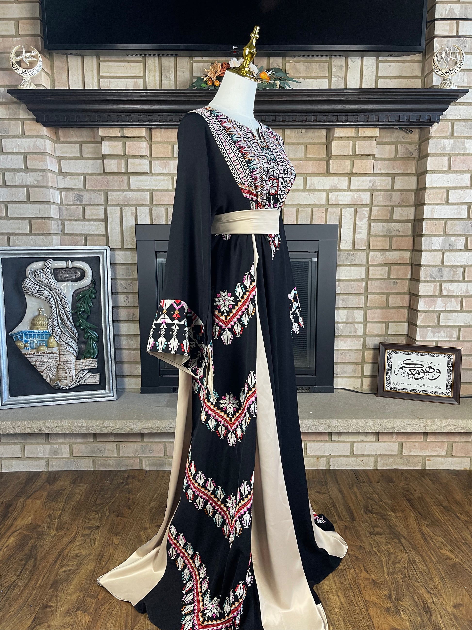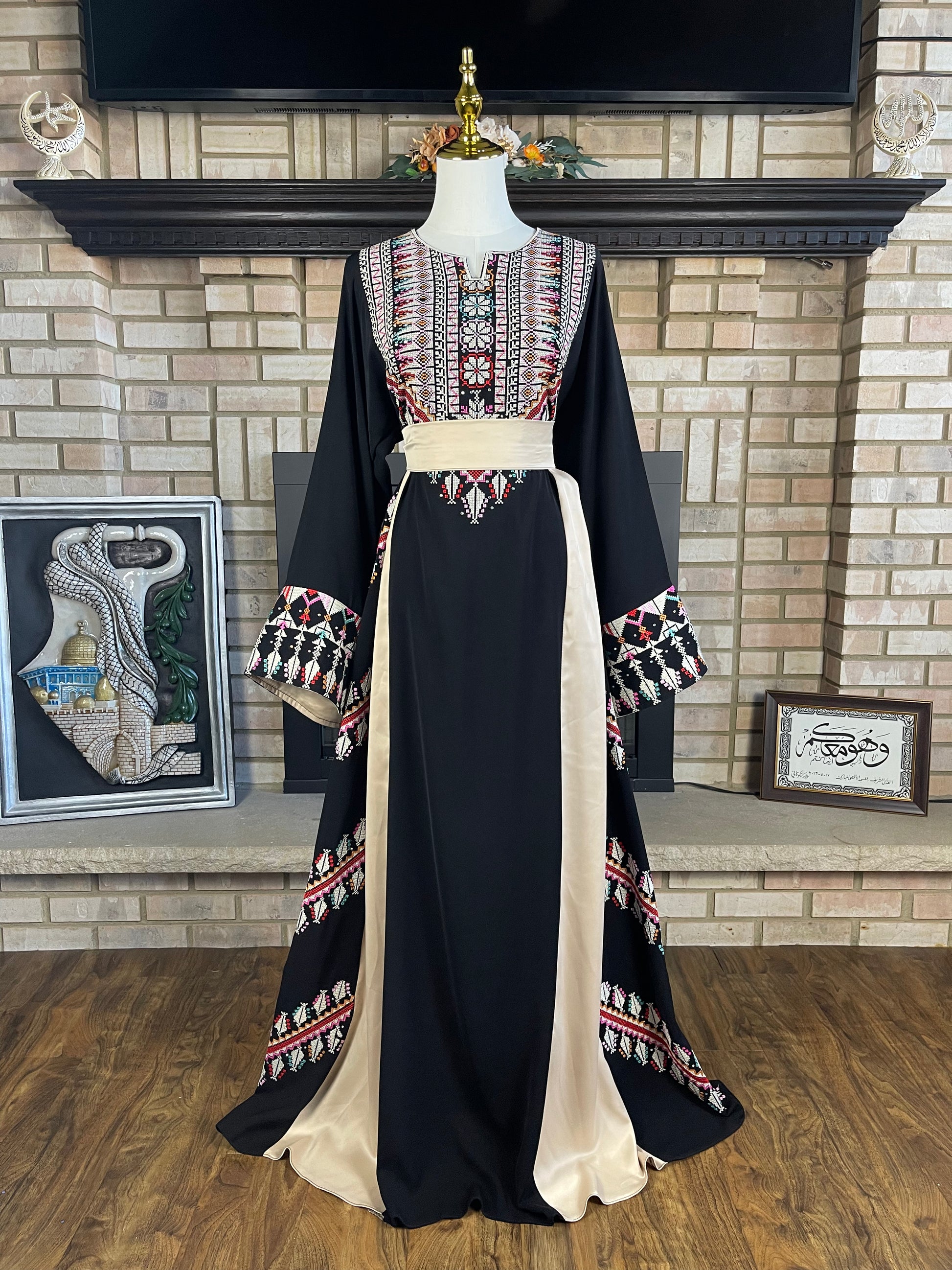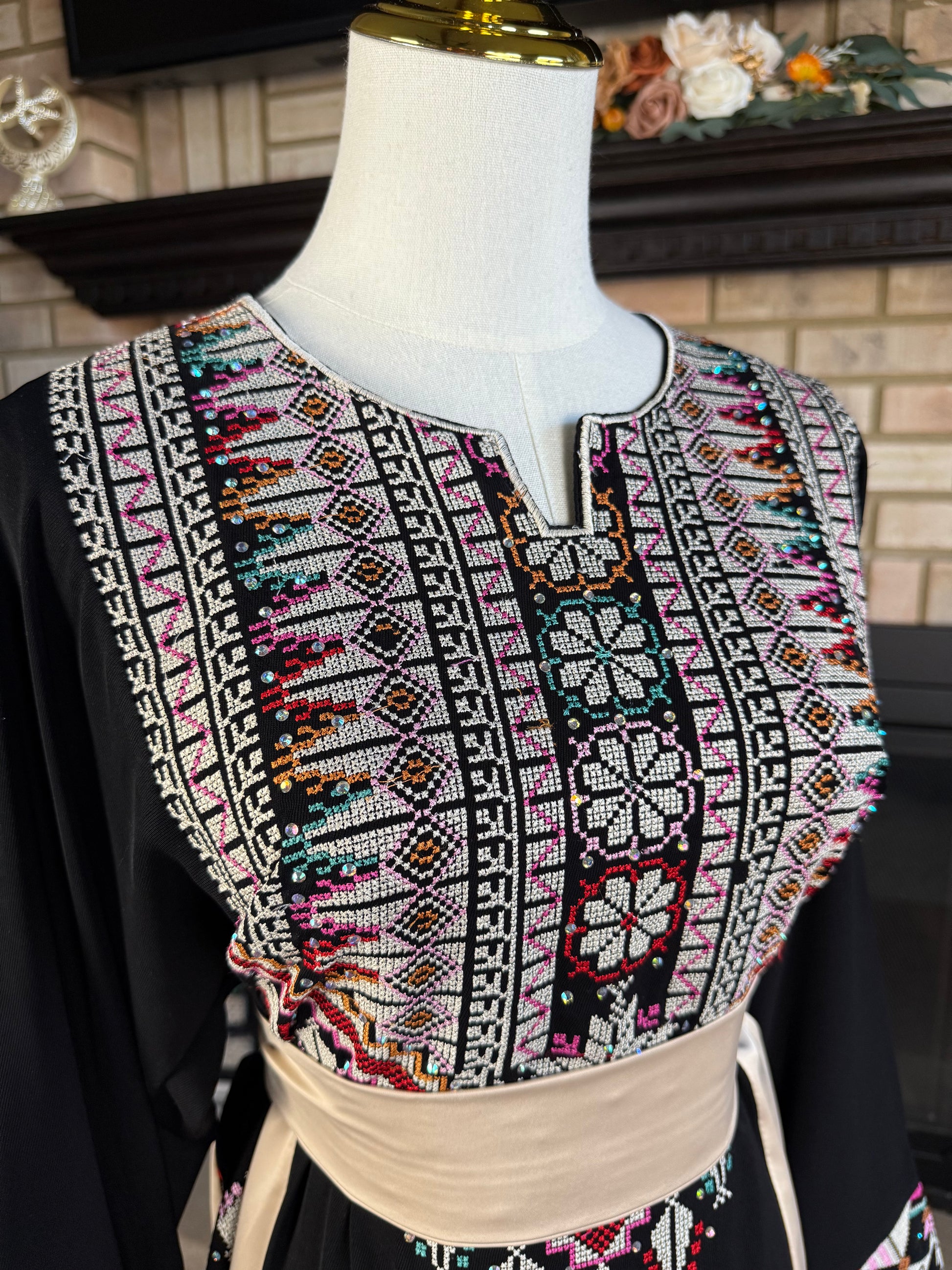 Charming black and gold thobe, featuring silky satin accents, beautiful cross stitching, and sparkling rhinestones.