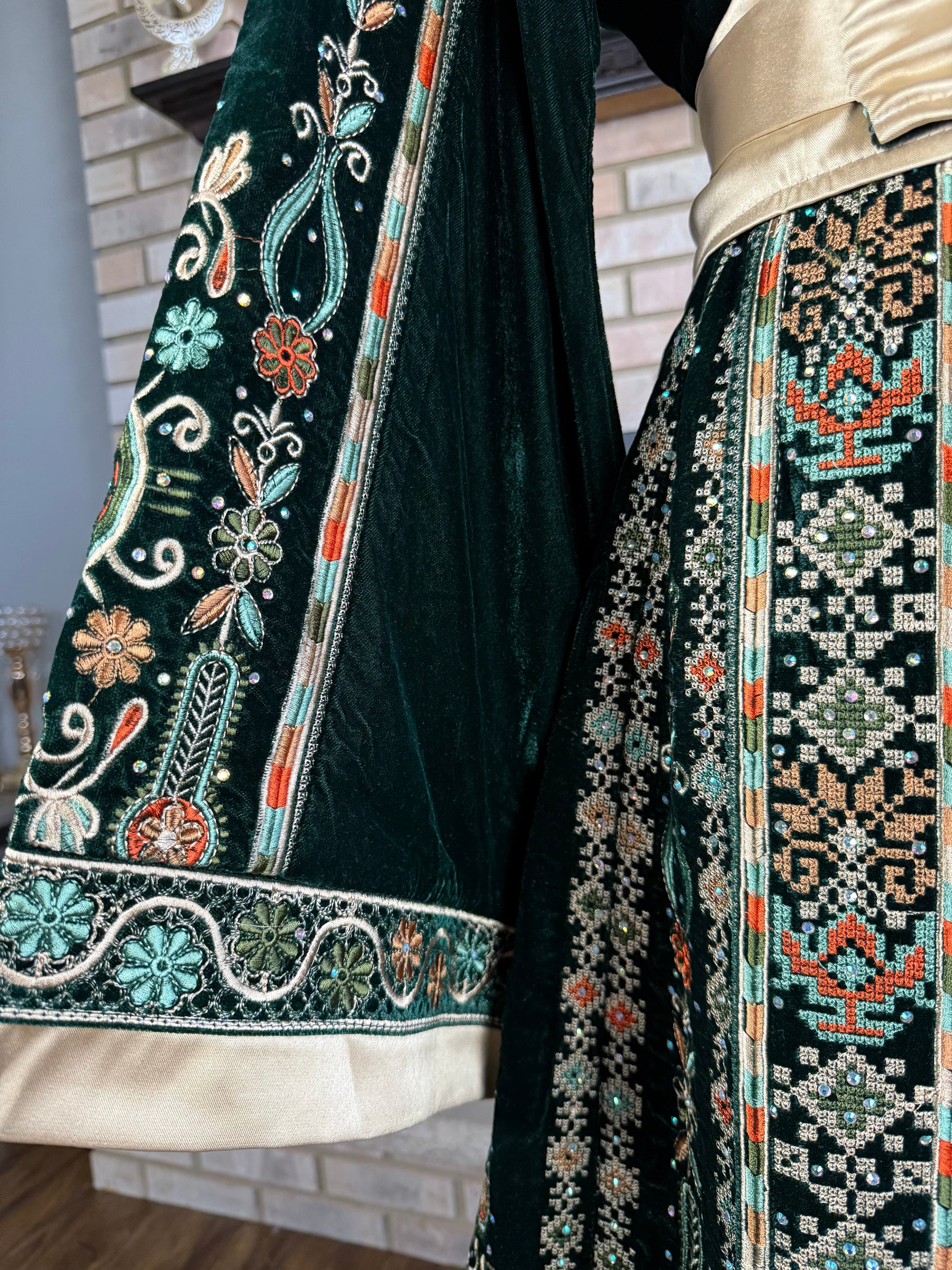 This premium green all-velvet malaka thobe is skillfully constructed from high-quality green velvet. It features full front and back embroidery and is decorated with sparkling rhinestones.